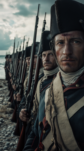 9. to whom their lives had been promised, an emotional scene of prisoners looking at French officers, 1799, Ottoman military attire, on a sandy shore, French flags and soldiers in the background, medium shot focusing on the expressions of fear and disbelief, hyper-realistic, photo realism, cinematography --ar 9:16
