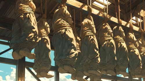 prisoners hanging from rope around wrist, all hanging in a line, Color Graded, prisoner hung by feet, vibrant colors, attention to detail, highly expressive, referencing the works of Osamu Tezuka, epic and intense --ar 16:9 --stylize 699 --niji 6