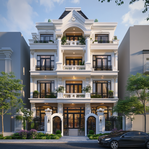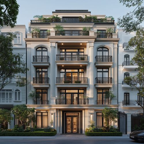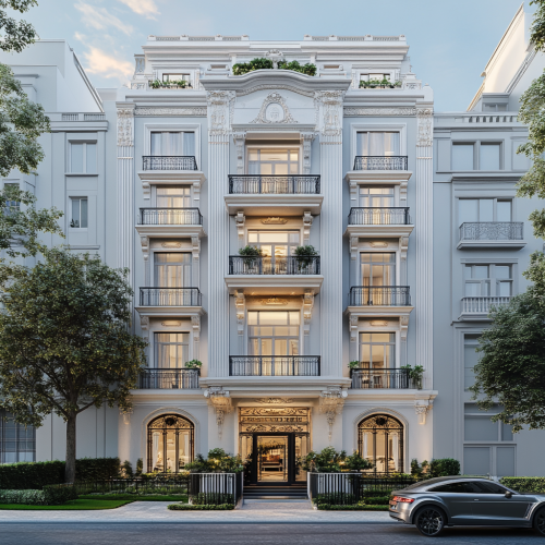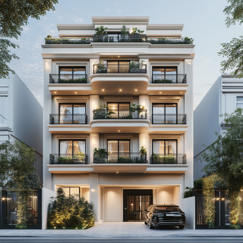 Close-up front view of an 8-level classical design building, 22 meters wide, with a penthouse on the top floor. The ground floor has plants on the left and a car entrance road on the right. Each floor has 2 residential units, with two classic balconies extending from the facade. The penthouse features plants on its terrace. Include both sides of the neighboring buildings in the scene.