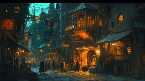 streetview of rennaisance fantasy city government district at night, storefronts, cargo, crowded, painted fantasy environment art style of pathfinder, dnd --ar 16:9