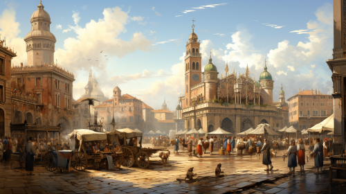 A bustling city square filled with market stalls, but also with noticeable government buildings. Officials are seen directing traffic, inspecting goods, and collecting taxes. Some stalls have signs protesting taxes, representing the interventionist state and the libertarians' stance on taxation. Vincenzo Camuccini painting style. --ar 16:9