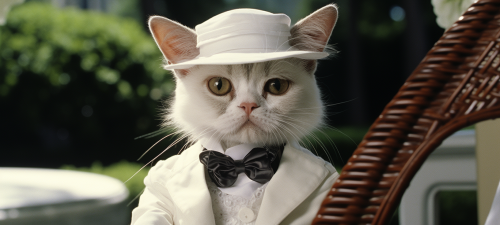 still photograph from the 1970s neo-baroque film a clockwork kitten directed by stanley kubrick, starring a feline kitten. kitten is wearing white shirt, white trousers, white braces and a white cricket codpiece, bowler hat, and cane --ar 20:9