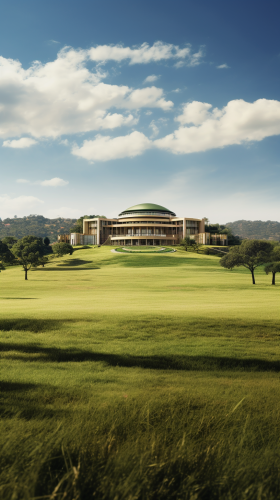 government building in eswatini, surrounded by a large green field of grass and trees, realistic, photography, --ar 9:16
