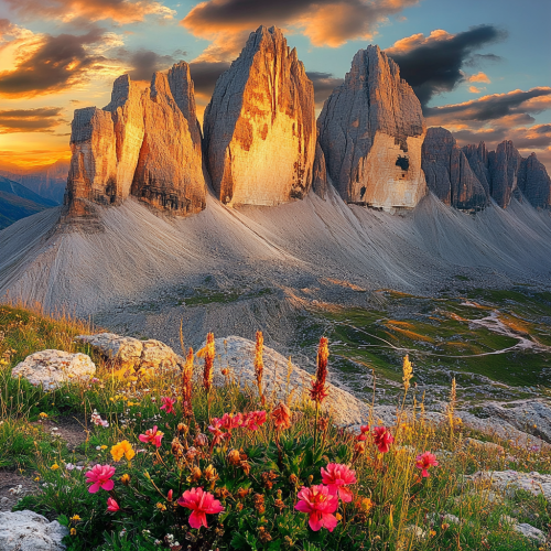 A breathtaking view of the Tre Cime di Lavaredo (Three Peaks of Lavaredo) in the Dolomites, Italy. The three towering limestone peaks rise dramatically from a rugged, rocky landscape. The central peak, the tallest, stands majestically, flanked by the slightly shorter northern and southern peaks. The scene is set at sunset, with the golden light casting a warm glow on the cliffs, highlighting their sharp edges and rough texture. Below the peaks, a high-altitude plateau is dotted with small patches of snow, alpine meadows, and a winding hiking trail. In the foreground, wildflowers and jagged boulders add detail to the natural scene. The sky is a mix of deep blue and fiery orange, with a few wispy clouds reflecting the colors of the setting sun. The sheer scale and beauty of the mountains create an awe-inspiring, almost mystical atmosphere.