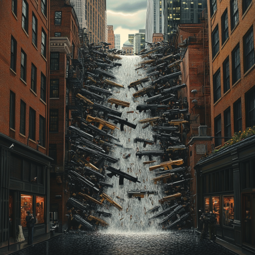 a sureal waterfall of guns flooding into city a boston downtown city street. mysterious, intriguing, evocative, awe-inspiring, photorealistic design, intricate details,