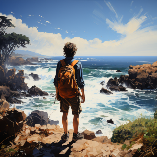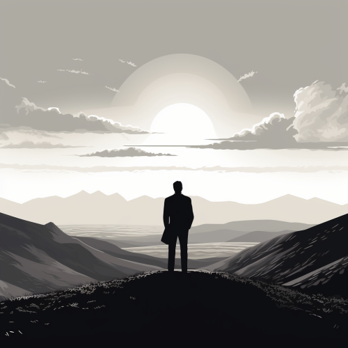 a man standing on hill to looking at a landscape, camera from behind, detailled illustration, vectoral looking, black and white, art deco style,