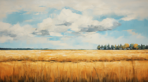 landscape painting, light blue sky, beige cornfield, dark green forests, in the style of oil painting --ar 16:9