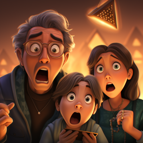 Mimi's parents with shocked and amazed faces as Mimi shows them the magical gem from her adventure.