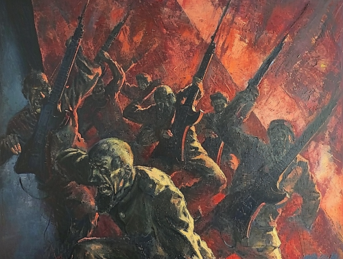 Man standing in front of an American flag while holding too many guns in the style of soviet propaganda mural