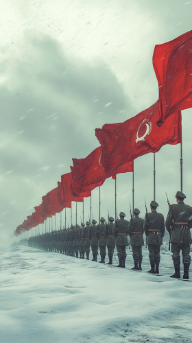 The Soviet Union’s World War II army lined up in the snow, with Soviet flags fluttering in an eerie wind – surreal, hyper-realistic, Ultra HD --ar 9:16