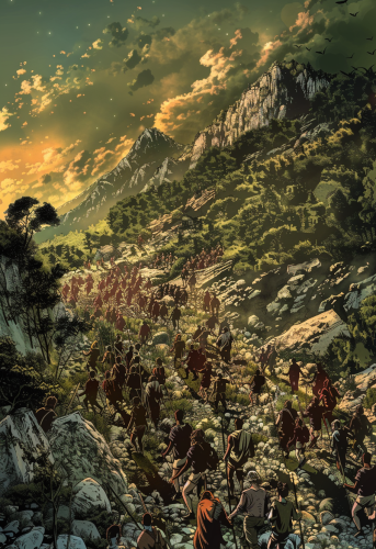 Bronze Age exodus of person emmigrating to a new area. Comicbook style art. --ar 11:16