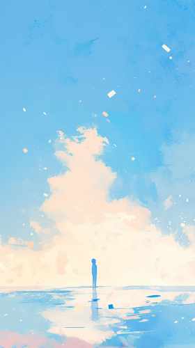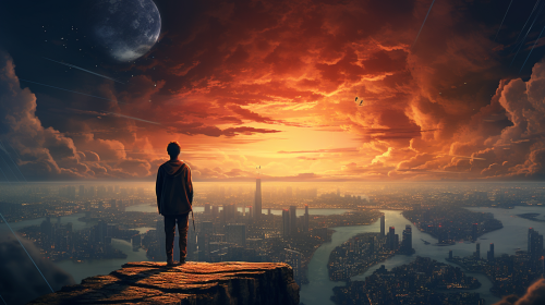 A serene landscape showing a figure standing at the edge of a cliff, gazing at a vast horizon. The background features a gradient sky transitioning from dusk to dawn, symbolising transformation and new beginnings. The figure appears calm, with loose threads or pieces of their past gently floating away into the wind, representing the act of letting go. The atmosphere is peaceful yet introspective, with soft natural lighting casting a hopeful glow over the scene.