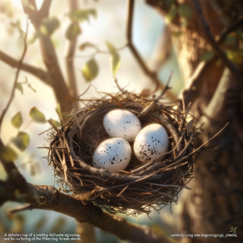 "A detailed close-up of a nest cradling delicate eggs, symbolizing new beginnings, potential, and the nurturing aspects of life, with soft light filtering through the trees above." Art Style: Photorealism with gentle, natural lighting and intricate details, emphasizing the fragility and promise of life --v 6.0