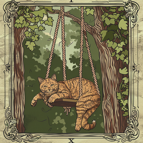 the hanged man tarot card with a cat in medieval woodcut style artwork