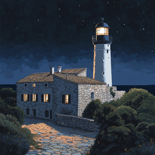 Visualize a beautiful drawing of the Cala Figuera Lighthouse, in Mallorca, which has a white shaft with diagonal black bands, the night is black, the figure of the lighthouse is large and stands out against the very dark blue-black background of the sky and the sea, the lighthouse is on and from above, 26 long beams of light come out from its flashlight, ultra high definition
