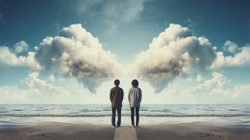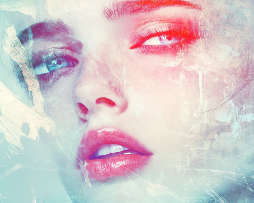a beautiful ethereal woman daydreaming with open eyes, staring with empty eyes into the horizon, the woman has a light makeup, you can see she has cried, emotional art with bright colors and negative colors, shapes are fluid and undefined, high definition digital art, a mix of pastel colors and neon, a poetic and creative perspective, inspired by Man Ray's visionary photography, large-screen camera, photo art that is also inspired by digital art, cold color scale with hints of flickering neon, --ar 5:4 --p 6s1y8tz