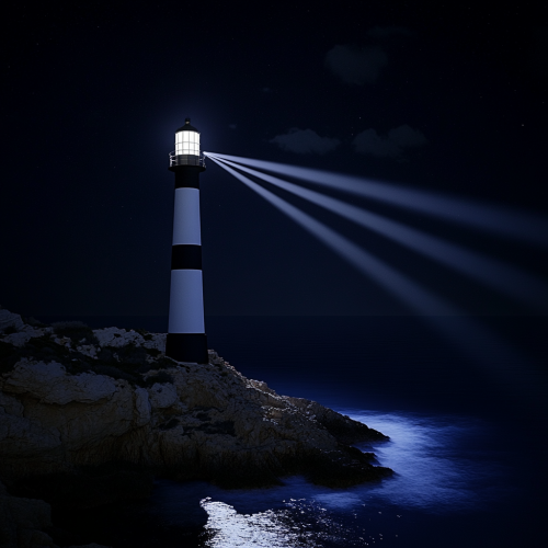 Visualize a beautiful drawing of the Cala Figuera Lighthouse, in Mallorca, which has a white shaft with diagonal black bands, the night is black, the figure of the lighthouse is large and stands out against the very dark blue-black background of the sky and the sea, the lighthouse is on and from above, 26 long beams of light come out from its flashlight, ultra high definition
