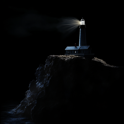 the figure of a solitary lighthouse on an island, the tower stand in top of a building with flat roof ant the edge of a cliff. it is night and the background is black, many rays of light come out of the lighthouse lantern, the figure contrasts with the black background, ultra photo realism, ultra high definition