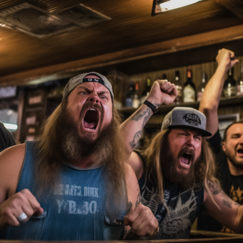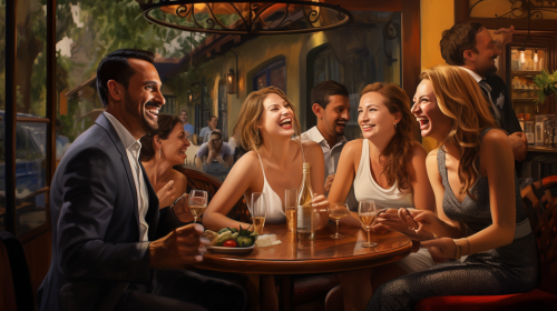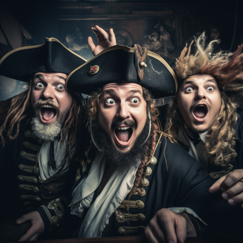 photo of several funny pirates::2 talking loudly, advertisement style, more pirates in background --style raw