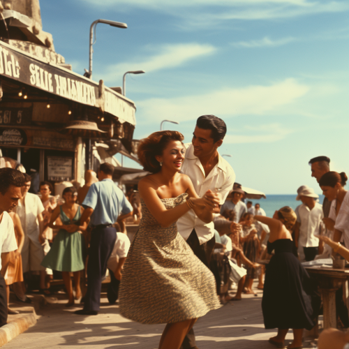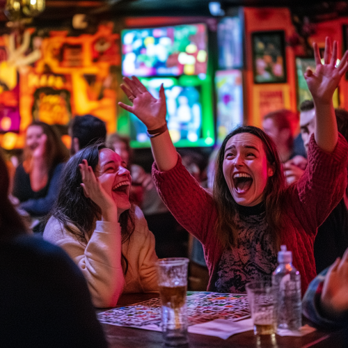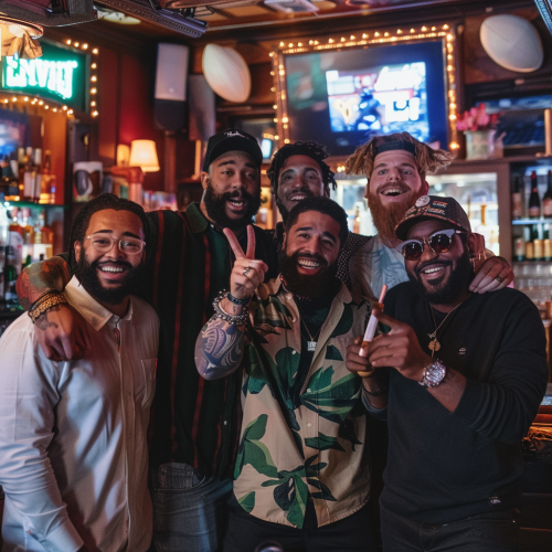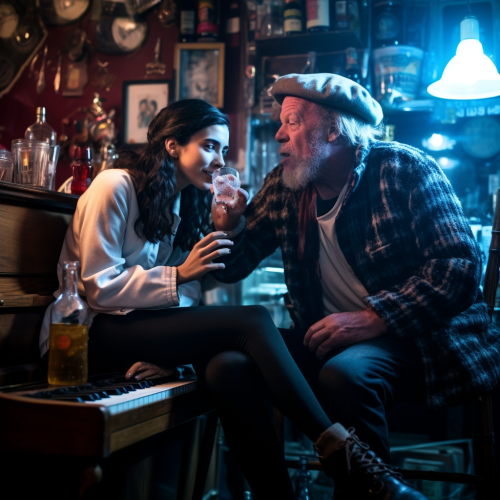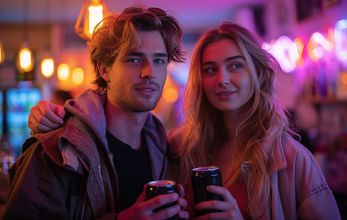 Realistic photo of a european male and female couple, each holding a solid black blank can. They are standing at an outside bar with ambient colorful lighting --v 6.0 --s 750 --ar 19:12