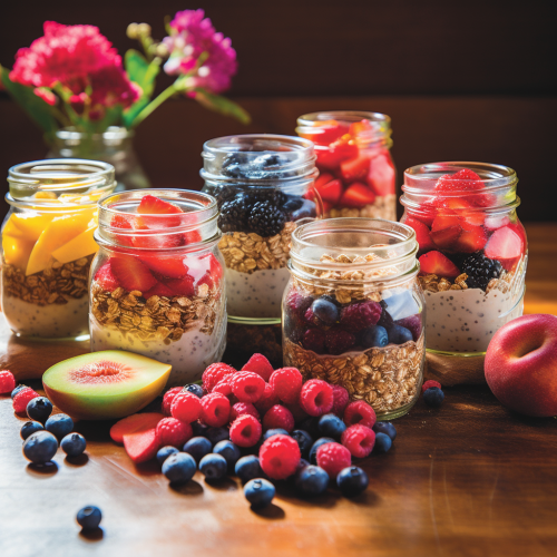 Dive into a lively preparation scene of assorted jars, each being meticulously filled with vibrant layers of fresh ingredients, capturing the art and anticipation of crafting overnight oats and chia puddings.