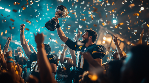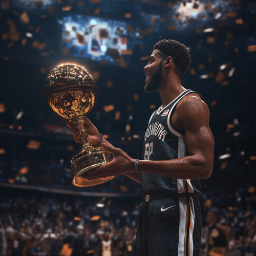picture of the Brooklyn nets winning the NBA Championship. Cam thomas holding the NBA Finals trophy after brooklyn wins the finals. Super realistic with attractive art. 4K