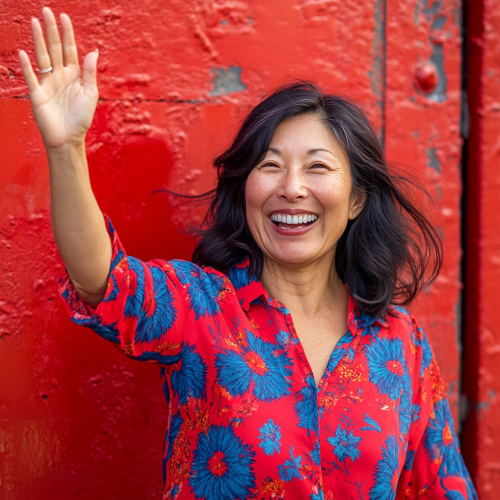 A fun, lighthearted image of a middle aged Asian woman celebrating a small win with a big smile. excited and playful. Wearing red and blue. Keywords: playful, celebration, high-five. Camera: DSLR, Lens: 35mm. Post: Bright, cheerful, with high contrast for a fun, celebratory feel.
