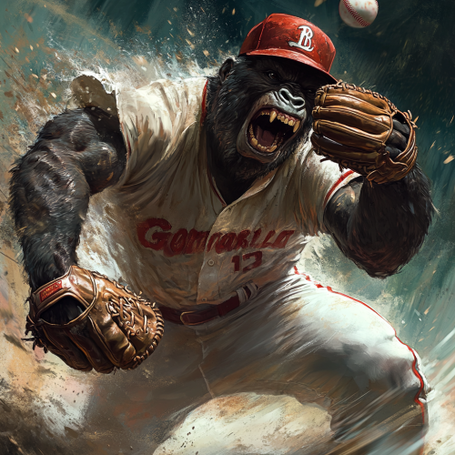 The player is GORILLA wearing a baseball uniform; let's create a dynamic baseball game scene. With the game winning by one run in the bottom of the ninth inning, the pitcher, GORILLA, throws a pitch with all his might to induce the opponent to strike out in a tense scene with the bases loaded and two outs. Sweat splatters through clenched teeth, highlighting the players' mental strength, determination, and resilience. The image gives the sense of movement as if he is just now throwing with tremendous dynamism.