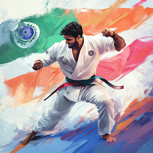 Create a powerful illustration of a male judo athlete celebrating his bronze medal win at the Paralympics. Show him in a dynamic pose, perhaps holding his judo belt or striking a victorious stance. In the background, prominently display the Indian flag waving proudly alongside the Paralympic logo. Use vibrant colors to highlight the Indian flag and the athlete’s uniform, capturing the energy and spirit of the win. The composition should evoke pride and determination, celebrating the athlete’s strength and achievement.