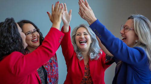 A fun, lighthearted image of a group of middle aged diverse business women celebrating a small win with a big smile. Age 45 years old. excited and playful. Wearing red and blue. Keywords: playful, celebration, high-five. Camera: DSLR, Lens: 35mm. Post: Bright, cheerful, with high contrast for a fun, celebratory feel. --ar 16:9