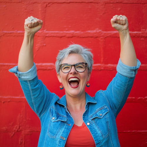 A fun, lighthearted image of a middle aged lesbian woman celebrating a small win with a big smile. excited and playful. Wearing red and blue. Keywords: playful, celebration, high-five. Camera: DSLR, Lens: 35mm. Post: Bright, cheerful, with high contrast for a fun, celebratory feel.
