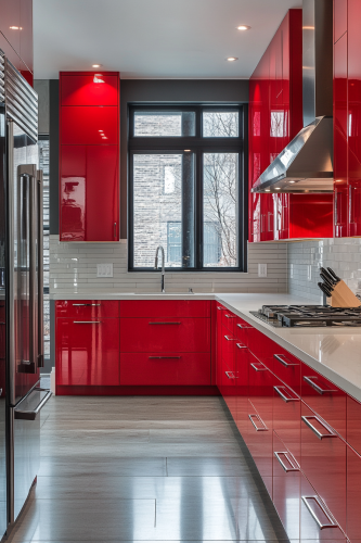 Show a kitchen featuring Candy Apple Coziness red kitchen cabinets, with a glossy candy apple red that brings a sense of fun and flair. Pair these cabinets with minimalist black or chrome hardware to keep the look sleek and modern. Opt for a simple white quartz countertop and a glass backsplash to maintain a clean, airy feel. The flooring should be a light gray polished concrete, providing a contemporary touch to the playful red. This kitchen should appear bright and modern, encouraging a cheerful and energetic cooking environment. Neat and organized. Camera: DSLR - Canon EOS 5D Mark IV. Lens: Canon EF 24-70mm f/2.8L II USM. Composition: Wide shot, room-centered, horizontal orientation, balance between furniture and space. Film: Digital, high resolution, color profile sRGB. Camera settings: ISO 400, f/2.8, 1/60 sec. --ar 2:3 --v 6.1 --s 250