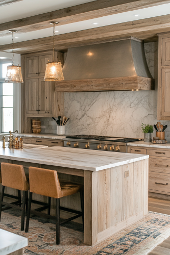 Create a photo of a chic rustic kitchen that combines rustic wooden elements with chic modern touches like marble countertops and gold hardware. The space should be stylish and sophisticated, with designer furniture pieces and decorative lighting fixtures that add a touch of glamour. The color scheme should be neutral with pops of color through accessories like vases and kitchenware. Elegant drapery and fine rugs could add layers of texture and luxury. This image should draw viewers who are interested in a kitchen that combines rustic foundations with chic, fashionable design. Camera: DSLR - Canon EOS 5D Mark IV. Lens: Canon EF 24-70mm f/2.8L II USM. Composition: Wide shot, room-centered, horizontal orientation, balance between furniture and space. Film: Digital, high resolution, color profile sRGB. Camera settings: ISO 400, f/2.8, 1/60 sec. --ar 2:3 --v 6.1 --s 250