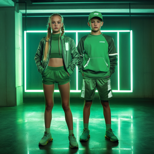Ultra-realistic 4K fashion photo of a 13-year-old girl and boy in a premium, high-end sportswear collection. The girl is dressed in a form-fitting sports top, a sleek windbreaker with reflective accents, and high-performance green leggings, paired with a stylish sweatband on her head. The boy is wearing a trendy green cap, a moisture-wicking t-shirt, and matching green shorts, all designed for comfort and movement. They are standing in a futuristic green-lit studio with a minimalist, high-fashion aesthetic. The entire scene is bathed in soft green lighting, casting a vibrant glow over the outfits and enhancing the premium, fashion-forward vibe. The kids pose confidently, highlighting the luxurious, designer feel of the athletic wear, with every fabric and texture appearing detailed and sharp in the lighting. The setting exudes a sleek, modern energy, blending high-performance sportswear with a fashionista touch