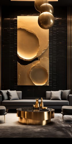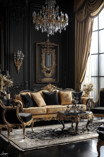 Create an image of a Gilded Gothic themed Western Gothic living room, where gold accents play against a backdrop of classic gothic darkness. The room should feature black walls and floors with splashes of gold on trimmings, chandelier details, and frame outlines. Furniture should be opulent, with golden damask upholstery and ornate carvings. Strategic lighting should highlight these gilded details, making the room sparkle against the dark tones. This image should dazzle viewers, drawing them into a sophisticated space that marries gothic architecture with luxurious gold embellishments. Neat and organized. Camera: DSLR - Canon EOS 5D Mark IV. Lens: Canon EF 24-70mm f/2.8L II USM. Composition: Wide shot, room-centered, horizontal orientation, balance between furniture and space. Film: Digital, high resolution, color profile sRGB. Camera settings: ISO 400, f/2.8, 1/60 sec. --ar 2:3 --v 6.1 --s 250