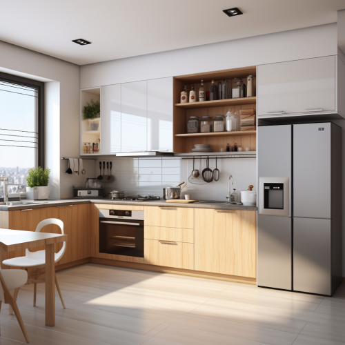 L-shaped kitchen cabinet 3m+3m long, refrigerator inside wooden frame as deep as the edge of the lower kitchen cabinet, upper cabinet touching the ceiling, simple modern style, apartment, upper kitchen cabinet with cabinet door, oven cabinet