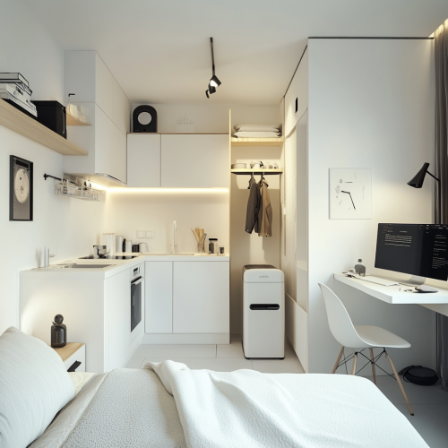 The image shows a residential space in the form of a small studio apartment. The structure and interior of the room are compact, but functionally composed, in a white tone overall, and contain elements like this. Kitchen space: Basic kitchen facilities are placed on the left. The sink is installed on one wall of the space, and on top of it is a white-toned top and bottom for holding kitchen supplies. As for home appliances, there is a small refrigerator at the bottom, and induction is also arranged, so simple cooking seems possible. Workplace: To the right of the room is a computer desk. There is a desktop computer on the desk, indicating that it is a space where you can study or work in this room. There is also a small drawer next to your desk to store necessary stationery and belongings. The chairs are office chairs with wheels for easy movement of users. Bedroom Space: A bed is placed at the bottom of the image. A white blanket over the bed adds to the overall bright and tidy atmosphere of the room. Wardrobe: A white closet sits on the right wall of the room, with several doors and drawers to organize your clothes or items. The closet is bright in tone, harmonizing with the rest of the room. Floor and carpet: The floor is white polling tile, which gives it a neat feel, and there is a small carpet next to the bed for a space-separating feel. This room is designed to be narrow but efficient as a whole, and it is a compact space that can meet basic living functions. This is a view of the room as a whole from the user's perspective.