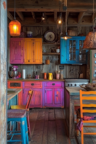 Visualize a colorful eclectic small cabin interior kitchen with brightly painted cabinets, mismatched chairs, and a variety of colorful textiles. Include unusual light fixtures and a diverse mix of patterns and materials. The decor should be bold and vibrant, reflecting a joyful and creative spirit. The kitchen should be tidy but full of life, showcasing an eclectic style. Photograph the kitchen to capture its playful, artistic atmosphere. Neat and organized. Camera: DSLR - Canon EOS 5D Mark IV. Lens: Canon EF 24-70mm f/2.8L II USM. Composition: Wide shot, room-centered, horizontal orientation, balance between furniture and space. Film: Digital, high resolution, color profile sRGB. Camera settings: ISO 400, f/2.8, 1/60 sec. --ar 2:3 --v 6.1 --s 250