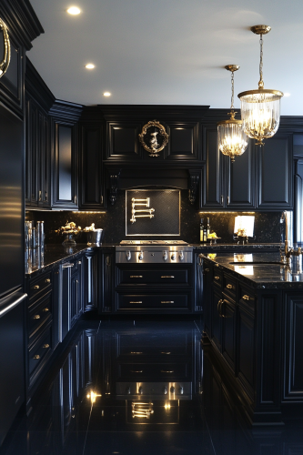 Show a luxurious kitchen outfitted with Ebony Elegance dark kitchen cabinets, accented with elegant gold handles. Pair these cabinets with a dramatic black granite island and pendant lights with dim gold lighting. The floors should be dark hardwood, adding warmth to the opulent black theme. Include a state-of-the-art espresso machine to enhance the functional yet stylish space. Neat and organized. Camera: DSLR - Canon EOS 5D Mark IV. Lens: Canon EF 24-70mm f/2.8L II USM. Composition: Wide shot, room-centered, horizontal orientation, balance between furniture and space. Film: Digital, high resolution, color profile sRGB. Camera settings: ISO 400, f/2.8, 1/60 sec. --ar 2:3 --v 6.1 --s 250