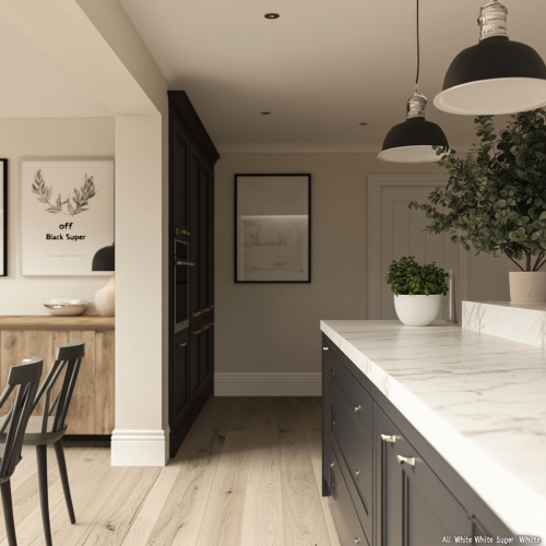 Create a realistic image of a kitchen using the following colours: Farrow and Ball's "off Black" no 57 for cabinets, Farrow and Ball's "All White" (No. 2005) for walls, and Quartzite worktops in "Super White" and oak floors. Make it light and airy and modern.