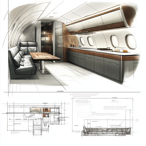 style sheet, sketches and industrial design drawings of the interior space with kitchen of a private jet, designed in the style of Dieter Rams and Fendi, designed with gray leather details and black thread and dark brown wood accents, inspired by A Luxuryfurniture, minimalism, a lot of labels and legend, color palette is dark gray, carbon grey, off white and dark blue with some soft orange tones, soft light colors, the table and sofa have multiple different features, very detailed architectural drawing, product photography --style raw --s 250