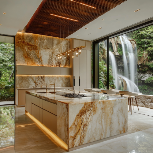 Design a bright and elegant kitchen that seamlessly integrates with the natural environment of a mansion built into a cliff under a waterfall. The kitchen should reflect the light, airy feeling of the surrounding space while incorporating modern luxury. Large floor-to-ceiling windows should provide a subtle view of the waterfall in the background, ensuring the natural beauty is always present but not overwhelming. The central kitchen island should be made of polished light marble with soft gold veining, creating an elegant focal point in the room. The island should include an integrated sink and a sleek stovetop with minimalist, flush-mounted controls. The marble surface extends seamlessly to the countertops, giving the entire kitchen a cohesive and refined look. The cabinetry should be a soft, matte off-white or light beige tone, keeping the space bright and open. The cabinets should be handleless for a minimalist, contemporary feel, with brushed gold accents on the hidden fixtures, bringing a subtle touch of warmth. Above the island, a suspended wooden ceiling feature with integrated, dimmable LED lighting mimics the natural textures of the surrounding cliffside. The lighting should be soft, creating a warm glow that complements the natural light from the windows. Appliances should be fully integrated and hidden behind custom cabinetry, keeping the clean lines of the kitchen. Brushed stainless steel and matte gold finishes should be used for visible appliances like the refrigerator and oven to keep the look modern yet warm. The flooring should be a light-toned stone, similar to the exterior cliff, creating a natural flow between the interior and exterior spaces. The seating area near the island should feature high stools with light upholstery in natural fabrics, [...]