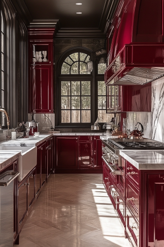 Create an image of a kitchen featuring Burgundy Bliss red kitchen cabinets, which offer a deep, wine-red hue perfect for a cozy, elegant setting. Pair these cabinets with dark soapstone countertops and a matching backsplash to create a seamless, sophisticated look. The flooring should be a rich, dark hardwood, providing a warm base for the dark cabinets. Elegant gold fixtures and a classic crystal chandelier can add a luxurious touch. This kitchen should radiate warmth and luxury, ideal for gourmet cooking. Neat and organized. Camera: DSLR - Canon EOS 5D Mark IV. Lens: Canon EF 24-70mm f/2.8L II USM. Composition: Wide shot, room-centered, horizontal orientation, balance between furniture and space. Film: Digital, high resolution, color profile sRGB. Camera settings: ISO 400, f/2.8, 1/60 sec. --ar 2:3 --v 6.1 --s 250