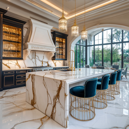 Design a grand, luxurious kitchen that reflects the mansion’s opulence while incorporating modern functionality. The kitchen should feature an expansive central island made of white Calacatta marble, with golden veining that harmonizes with the rich tones of the mansion's exterior. The marble countertop should have intricate, beveled edges, adding a sense of classical refinement. The island should have ample seating for casual dining, with plush velvet bar stools in a deep navy or emerald, accented with brass or gold legs to enhance the sense of luxury. The custom cabinetry is crafted from dark, rich walnut wood with detailed, inlaid paneling, and subtle gold handles, complementing the classical aesthetic. Upper cabinets feature glass doors with gold trimming, showcasing a collection of fine porcelain and crystalware, while concealed lighting adds a soft glow to highlight the textures. Beneath the island, the cabinetry includes a built-in wine fridge and additional storage space. Above the island, a row of three pendant lights hangs, each a masterpiece of blown glass and gold accents, providing warm lighting while maintaining an air of sophistication. The back wall of the kitchen features a double oven encased in a gold-trimmed, custom marble range hood, extending to the ceiling with ornate detailing. Surrounding the range, there is a stunning backsplash of white and gold marble, perfectly aligned with the tones of the island. The flooring is a seamless continuation of the polished marble found in the living room, carrying subtle gold and beige accents. The large, arched windows mirror the exterior, allowing natural light to flood the space and offer breathtaking views of the garden or terrace. Smart appliances are seamlessly integrated, blending into the [...]