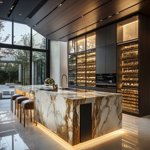 Design a sleek, high-end kitchen that complements the modern aesthetic of the Hollywood mansion. The kitchen features a spacious open-plan layout with an expansive central island made from polished white quartz with delicate gold veining, creating a luxurious focal point. The island has built-in cabinetry in matte champagne tones, with under-counter lighting to add a soft, ambient glow. Bar stools with soft tan leather upholstery and bronze legs are placed around the island, providing a sophisticated seating area. The countertops are similarly crafted from pristine white quartz, while the backsplashes feature subtle textured tiles in a neutral beige, bringing in warmth without disrupting the clean aesthetic. High-end appliances, fully integrated into the cabinetry, feature brushed stainless steel finishes to maintain a seamless look. The cabinetry itself is made from a light oak wood, providing a natural, soft contrast to the sleek surfaces. Above the island, a row of modern pendant lights in brushed gold hang, casting soft, diffused lighting across the space. The flooring is a continuation of the pale marble seen in the living room, ensuring visual flow between the spaces. Large windows, matching the floor-to-ceiling design from the rest of the house, allow for plenty of natural light and open up to the outdoor dining area. Sliding glass doors make it easy to transition from indoor to outdoor spaces, where a sleek outdoor kitchen mirrors the indoor design, with a minimalist approach to luxury. One wall is dedicated to a floor-to-ceiling wine cooler, encased in glass and backlit with soft, warm lighting, showcasing an extensive collection of fine wines. Adjacent to the wine cooler is a built-in coffee station with high-end appliances seamlessly integrated into the [...]