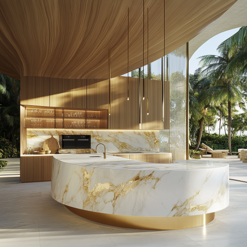 Design a luxurious open-plan kitchen in a tropical island mansion, featuring sleek, minimalist architecture with curved elements that echo the flowing lines of the mansion’s exterior. The kitchen has an oversized marble island with a soft waterfall edge, made from polished white Carrara marble with subtle gold veining. This island doubles as both a cooking and casual dining area, with built-in induction cooktops and a hidden pop-up ventilation system to maintain the clean, uninterrupted lines. The cabinetry is crafted from rich, light oak wood, finished with matte gold handles to bring a touch of elegance. The wood’s light tones blend seamlessly with the natural landscape, complementing the surrounding greenery visible through the floor-to-ceiling glass walls that wrap around the space, offering uninterrupted views of the ocean and tropical surroundings. Behind the island, a fully integrated appliance wall is concealed by custom paneling that matches the cabinetry, creating a streamlined, clutter-free aesthetic. The appliances, including a double-door refrigerator, wall ovens, and wine coolers, are all state-of-the-art and seamlessly integrated into the design. The backsplash is a standout feature, with a full slab of Calacatta gold marble running from countertop to ceiling, giving a luxurious, bold contrast to the neutral tones. The open shelving above the counters is made of glass and gold accents, displaying modern glassware and tropical-inspired decor, adding an artistic touch to the space. Pendant lights hang above the island in a cluster of organic shapes, mimicking sea urchins or coral formations, casting warm, ambient lighting across the kitchen. The lighting system includes recessed LEDs in the ceiling, which are programmable to change warmth and [...]