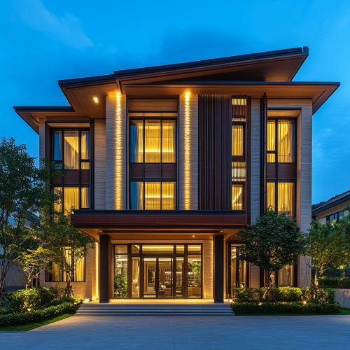 Photos of Taiwan's high-end luxury homes focus on showcasing the luxurious texture of the building's exterior and interior spaces. The image should include the exterior of a high-end residential building, highlighting its landmark design, and incorporate spacious interior layouts that showcase high-end building materials and exquisite furnishings. The interior should have bright lighting, elegant furnishings, and modern decorative details, presenting an example of the condition of a luxury home and conveying the unique value and comfortable living atmosphere of a high-end residence.