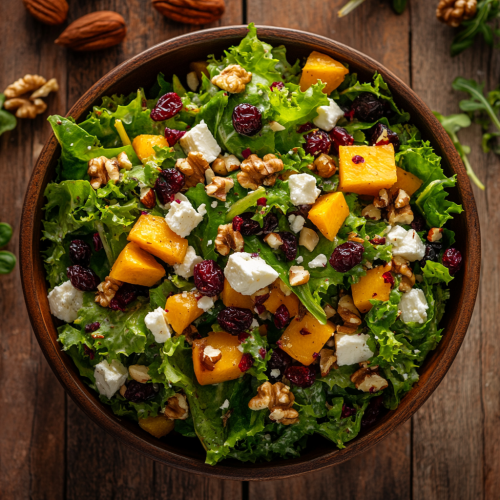 Artistic, high-end amateur photo of a Sunset Orchard Salad. The salad features mixed greens, roasted butternut squash, craisins, walnuts, and feta cheese, dressed with a warm apple cider vinaigrette. Arrange the salad in a simple, elegant bowl on a rustic wooden table. Capture the natural colors and textures of the ingredients with soft, warm lighting to create a fresh, inviting look.