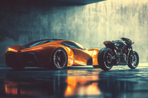 Photorealistic image of a luxury car and high-end motorcycle, positioned closely together, highlighting the smooth curves of the car’s body and the dynamic design of the motorcycle, both exuding sophistication and status. Realistic photo, 8K resolution --ar 3:2 --v 6.1 --style raw
