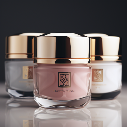 a close up photo three high end cometic product jars of different shapes and sizes. Logo NS on each of them. The creams look super luxirious. Ultrarealistic high quality image